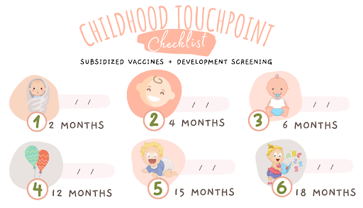 Developmental screenings are conducted at 7 recommended touchpoints in the first 6 years of your child’s life. They are often done concurrently with childhood vaccinations to reduce the number of doctor visits which may require the caregiver to take time off to bring the child.
